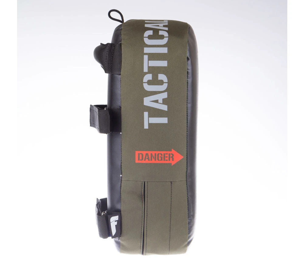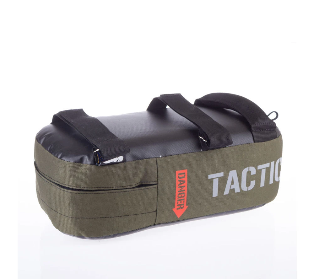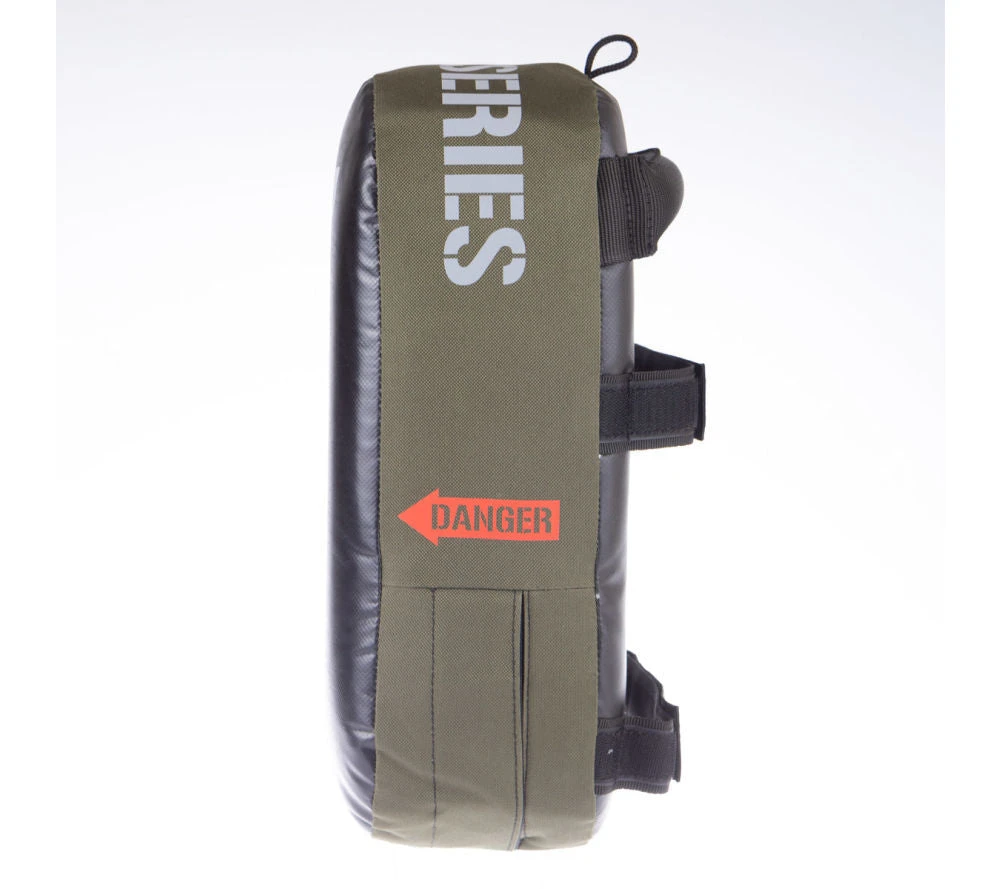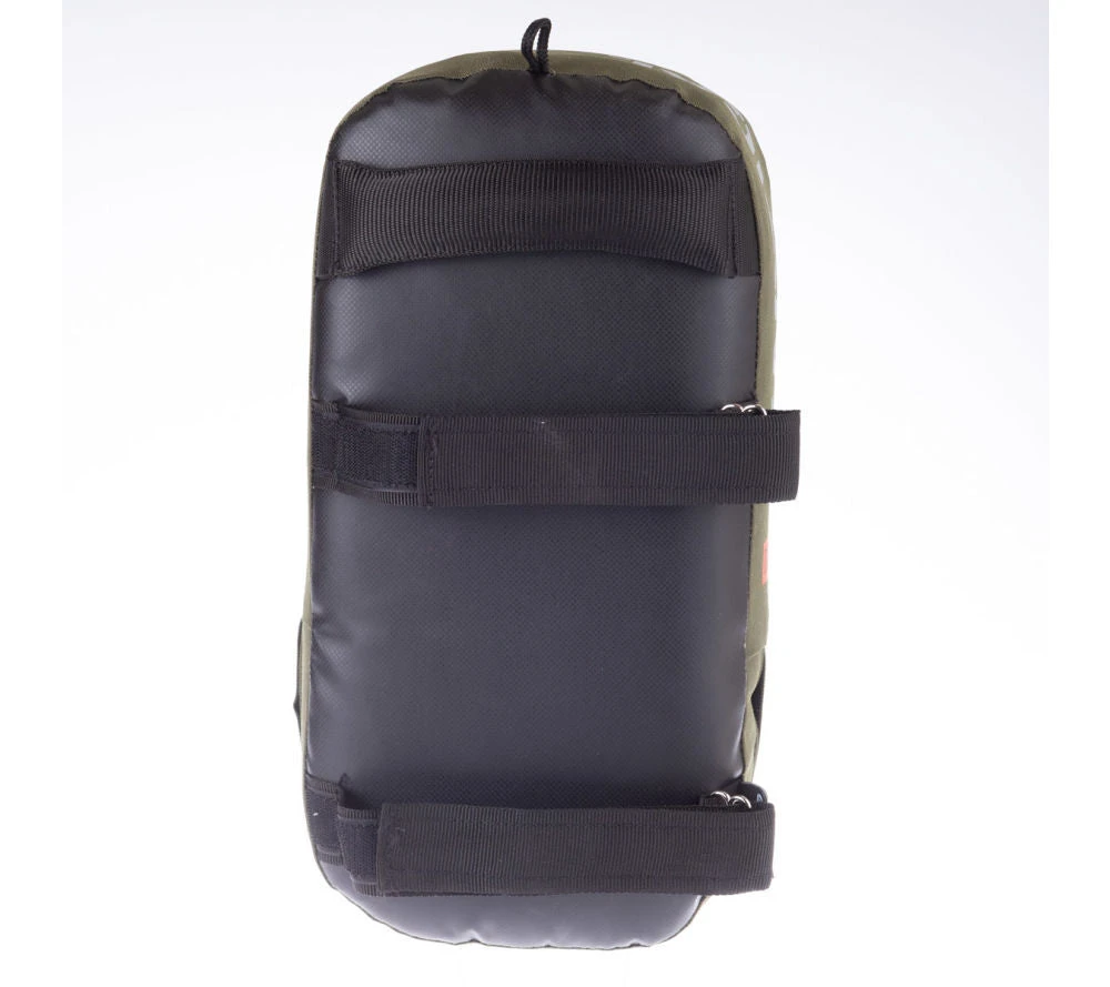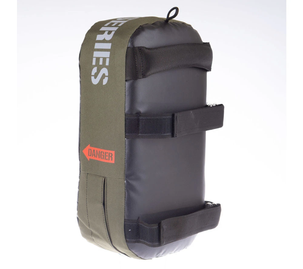 The Kicking Pad is made of high endurance vinyl. Large oval design is contoured for comfort handling. With adjustable velcro straps.