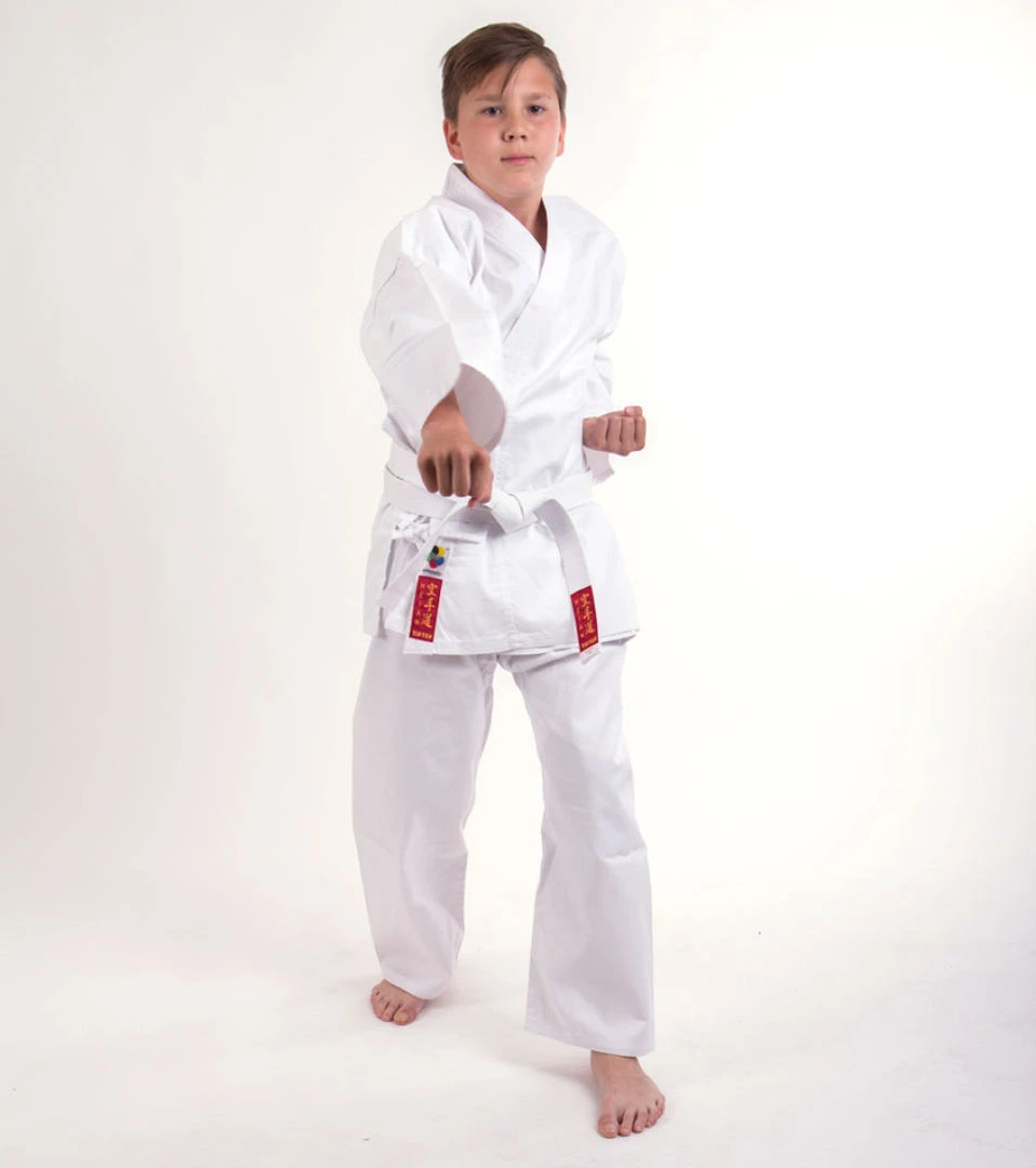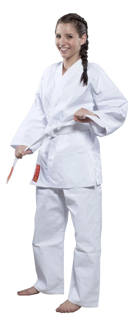 Hayashi Lightweight traditional Karate uniform with cross-over tie jacket and elastic waistband pants with hidden drawstring. Polyester/cotton mix. Perfect for beginners. The Hayashi Heian uniform is constructed of 7 oz cotton-polyester fabric for breathability and minimal wrinkles after washing. White belt included. World Karate Federation approved.Â