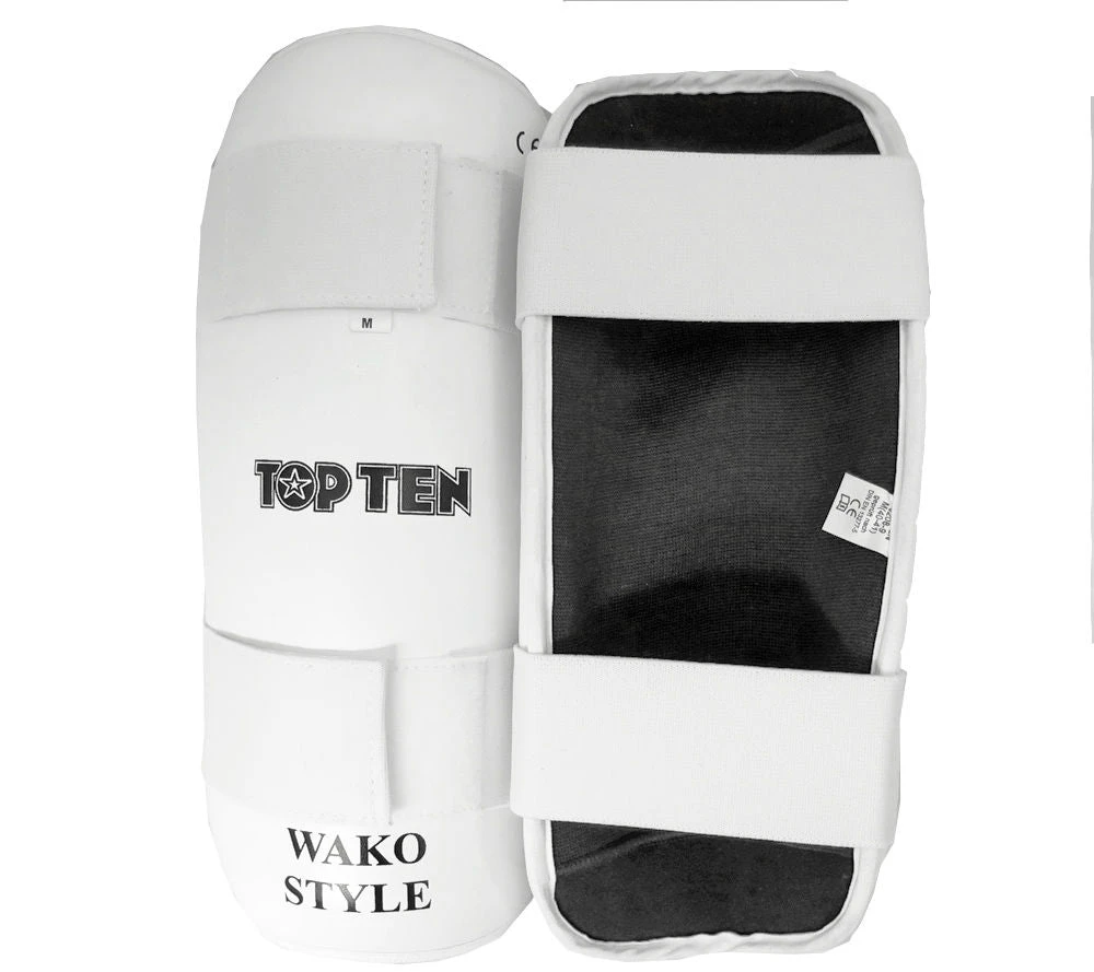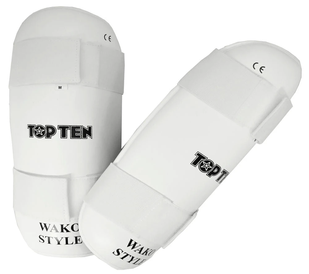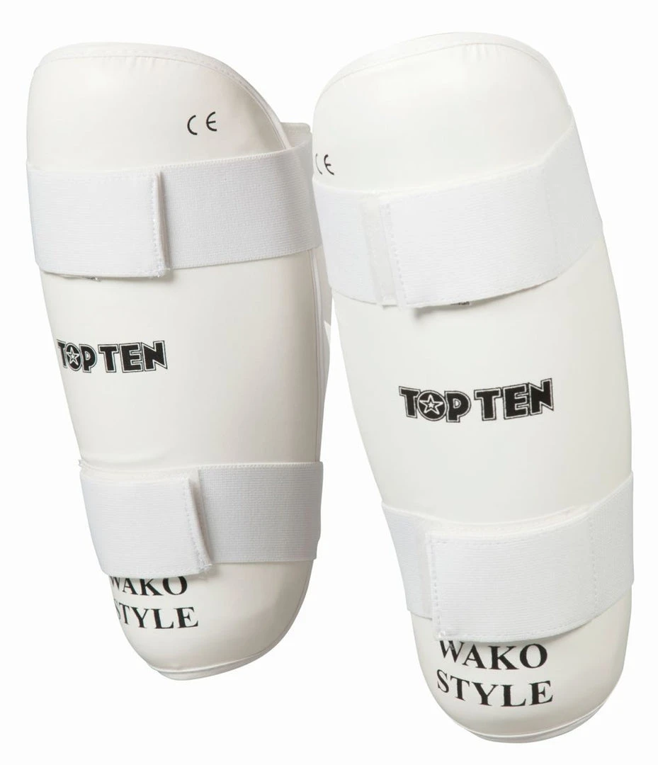TOP TEN Pre-shaped shinguard with high density foam. Covered with synthetic leather. These shin guards are used for point-fighting sparring and competition in WAKO tournaments and on the open karate tournament circuit. Suitable for light-contact in combination with safety kicks.