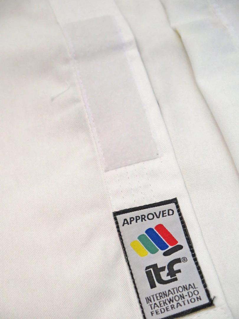 Bright White jacket top has velcro center closure, no crossover ties to fuss with. Features embroidered front chest ITF patch and brilliant 5 color ITF design below with a right side TOP TEN shoulder patch. Bold black underlined semi-circular TAEKWON-DO, plus Hangul TAEKWON-DO (Korean) vertical characters centered on the back.Â