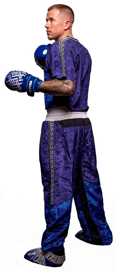 Brings together what belongs together. The long “Prism” kickboxing pants by TOP TEN combine comfortable casualness with the demands on functional sportswear. There is also an incomparable style with a graphic “Prism” print and a woven TOP TEN structure. The straight cut of the pants has an extra kick insert in the crotch so that the “Prism” can withstand extreme loads. The mesh inserts in the inner leg area and on the back waistband ensure great wearing comfort. A special dividing seam sets a visual accent and guarantees a comfortable fit on the leg without twisting or sliding up. The finishing touches for an athletic look are brought to the “Prism” kickboxing pants by the woven tape on the outer seam.